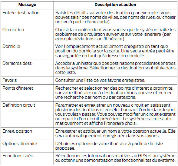 Note : si vous cherchez seulement à vous rendre dans un quartier d'une ville par exemple, il vous suffit de saisir le nom du quartier et de lancer le guidage. Structure du menu